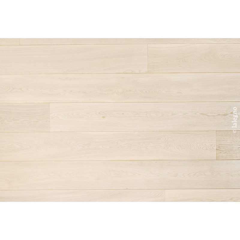 Ici, il s'agit d'un plancher qui a été brossé pour mieux accentuer le beau dessin dans le bois en chêne. Il a été fini avec une huile blanc mat qui lui donne une teinte trés sophistiqué.